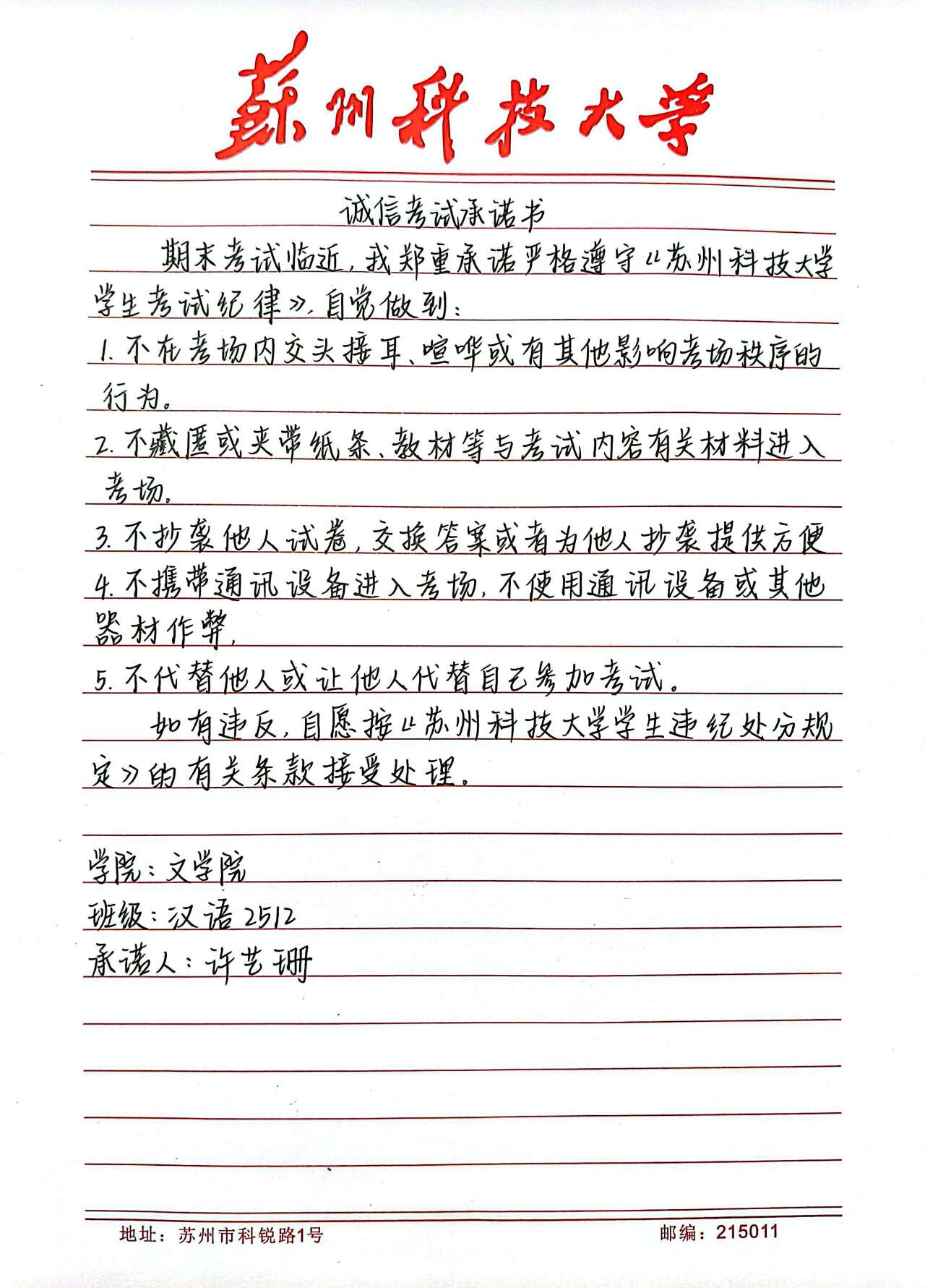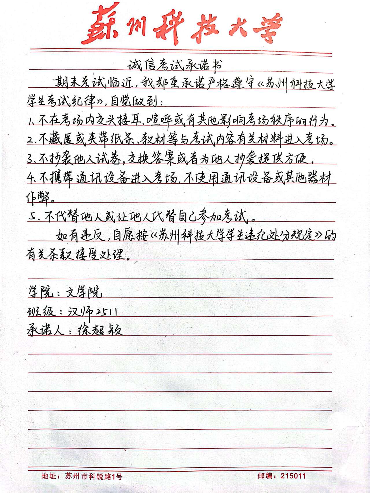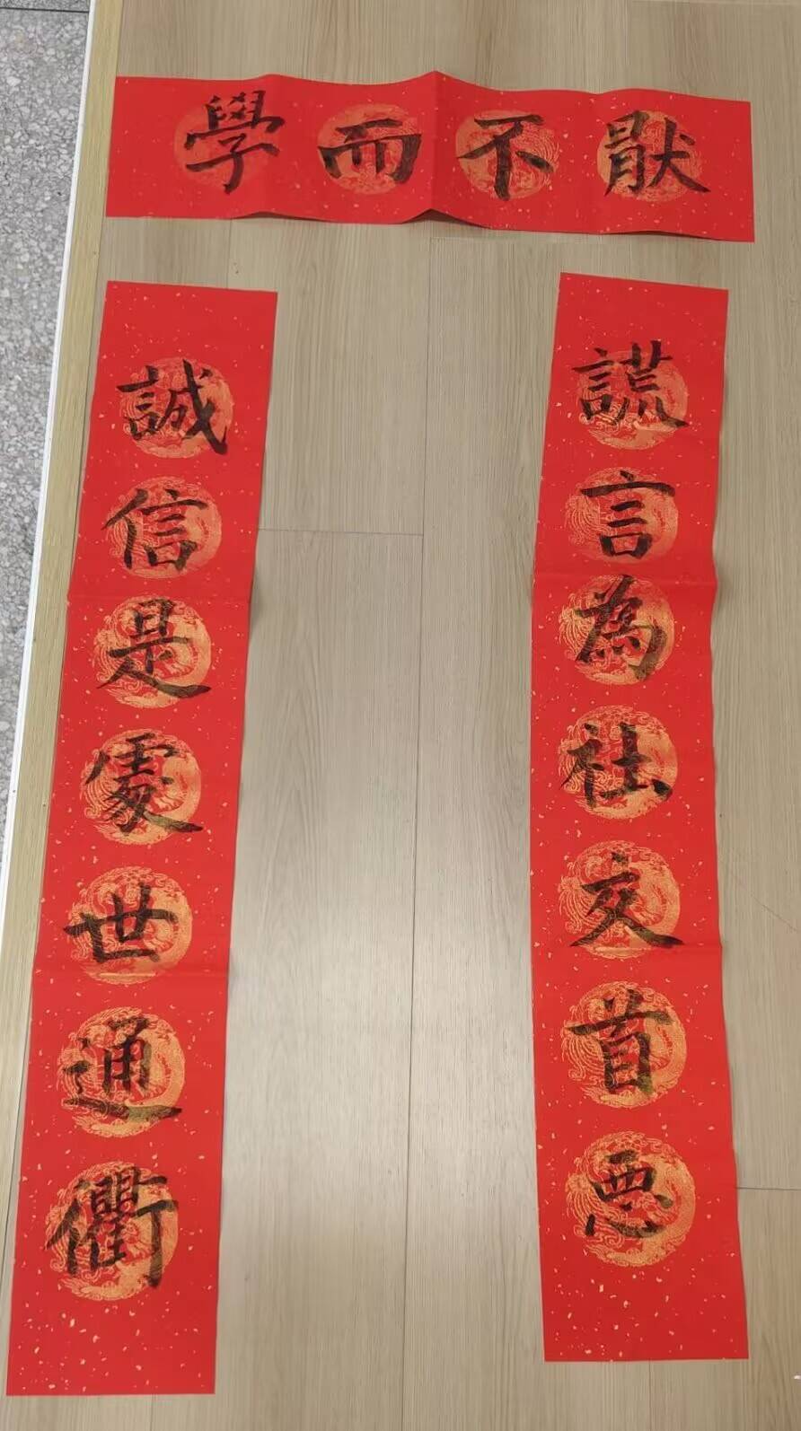 汉语2512的班长从“诚信是立人之根本”入手,通过组织同学们抄写《诚信考试承诺书》、创作诚信考试对联,强化了同学们的诚信考试意识。此外,汉语2512班长提醒同学们要做好期末复习,为大一上学期画上圆满句号。
