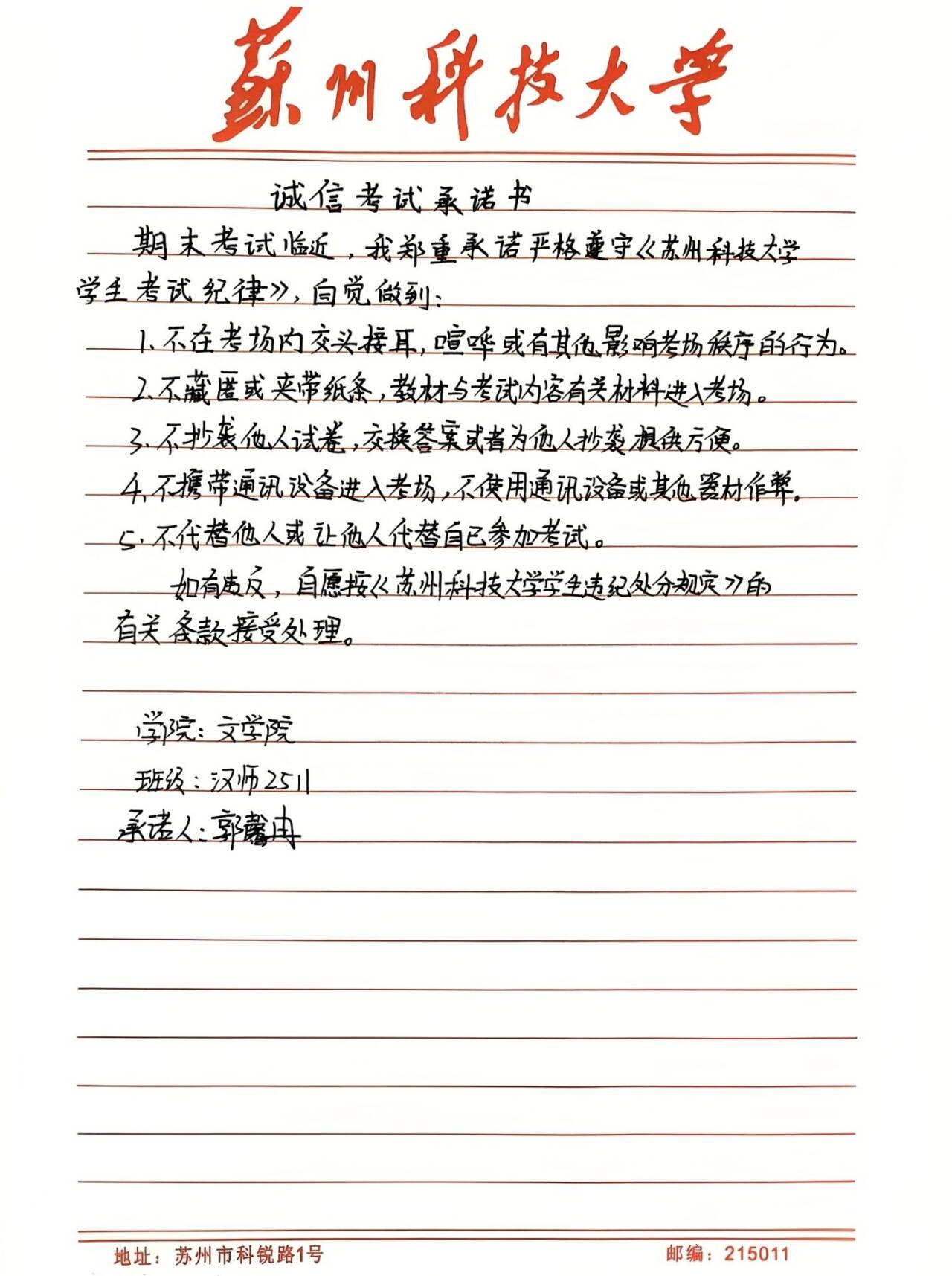 同学们郑重提笔,逐字誊写《诚信考试承诺书》。墨痕落处,是一诺千金之誓;纸笔之间,是守正持真之约。一纸承诺,将诚信铭刻于心,外化于行。
