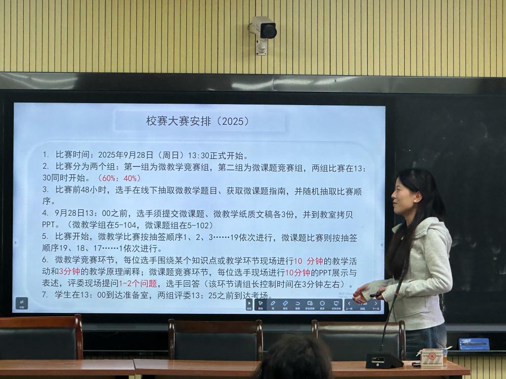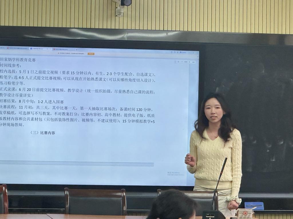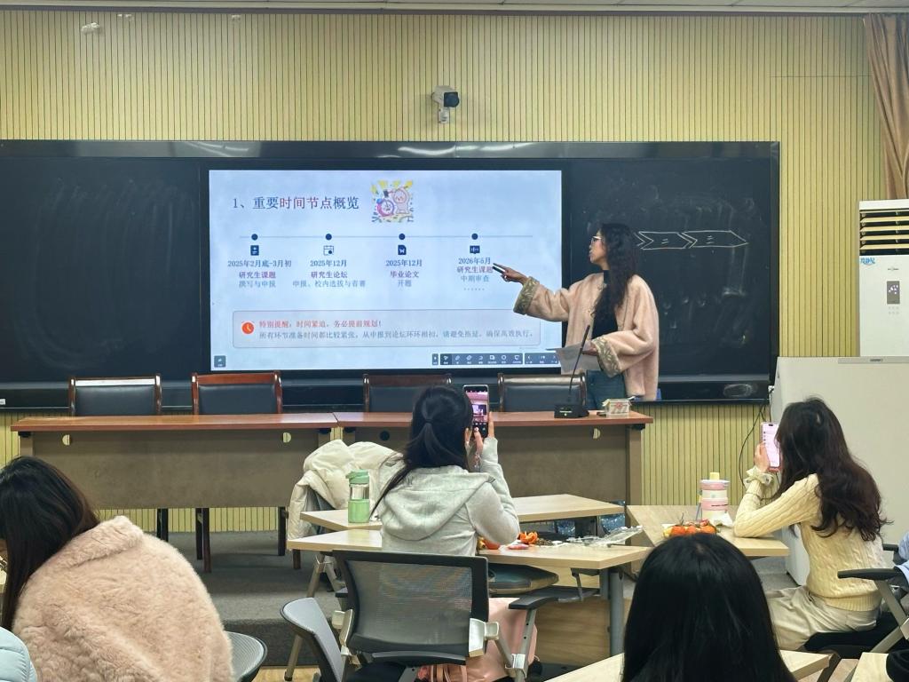随后,马慧、汤文博、陆冰灵三位24级研究生分别分享了自己的竞赛与学术经验。马慧分享了关于“田家炳杯”教学技能大赛的经验,她建议25级学科教学(语文)专业的研究生们要仔细研读比赛要求,注重教态的优雅与自信,在反复打磨中形成自己独特的教学风格。汤文博围绕教育硕士实践创新能力大赛,从比赛时间、内容、注意事项等方面进行了细致分享。她强调,“语文教学能力的提升任重而道远,绝非一朝一夕之功,关键在于持之以恒地积累与不断创新。”陆冰灵同学则结合自身经历,分享了课题申报和研究生论坛获奖的心得。她以“是瓜而苦,成果而甘”寄语同学们,鼓励大家以勇气和坚持走好学术之路。
